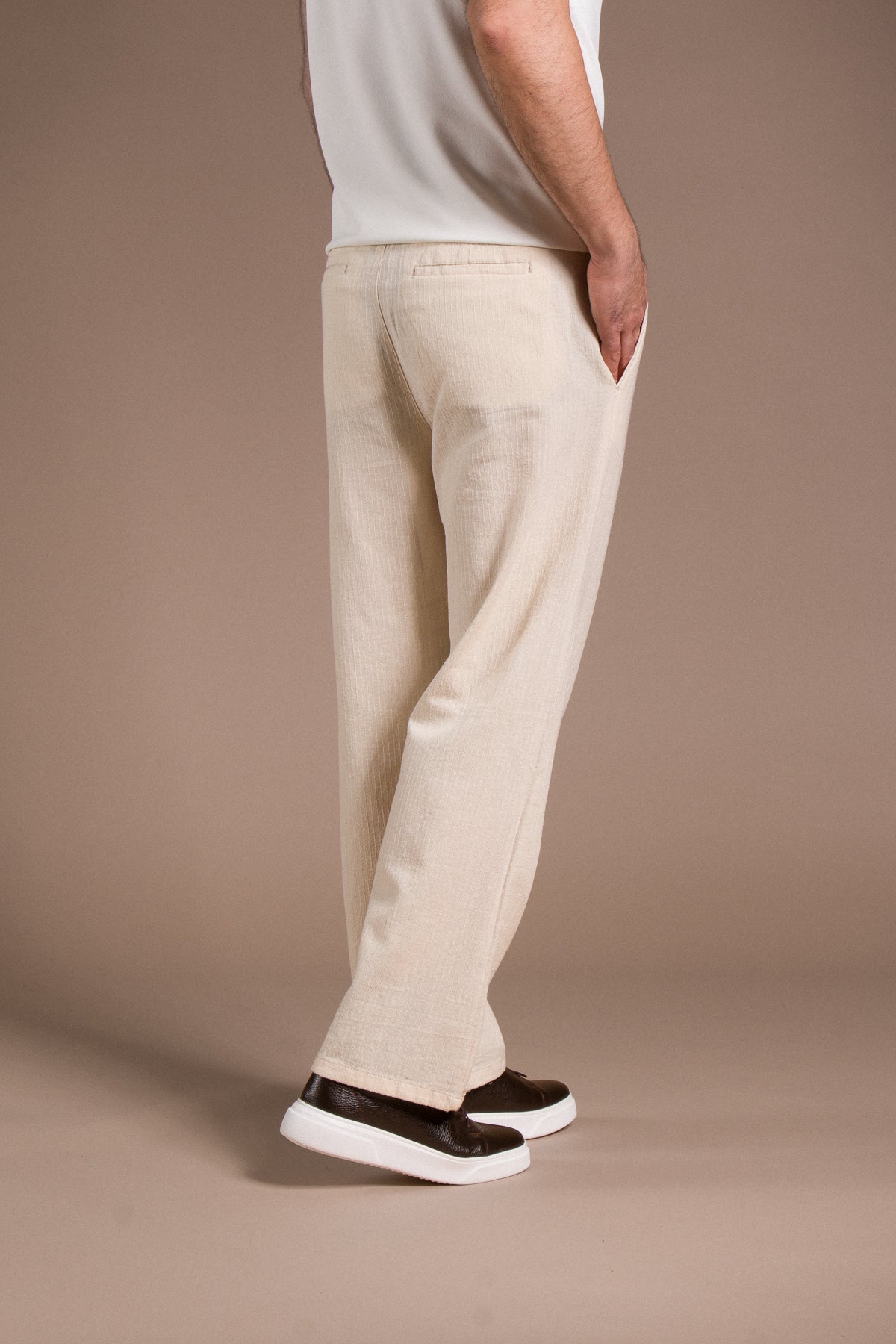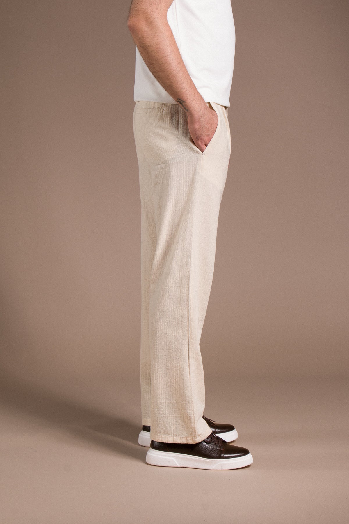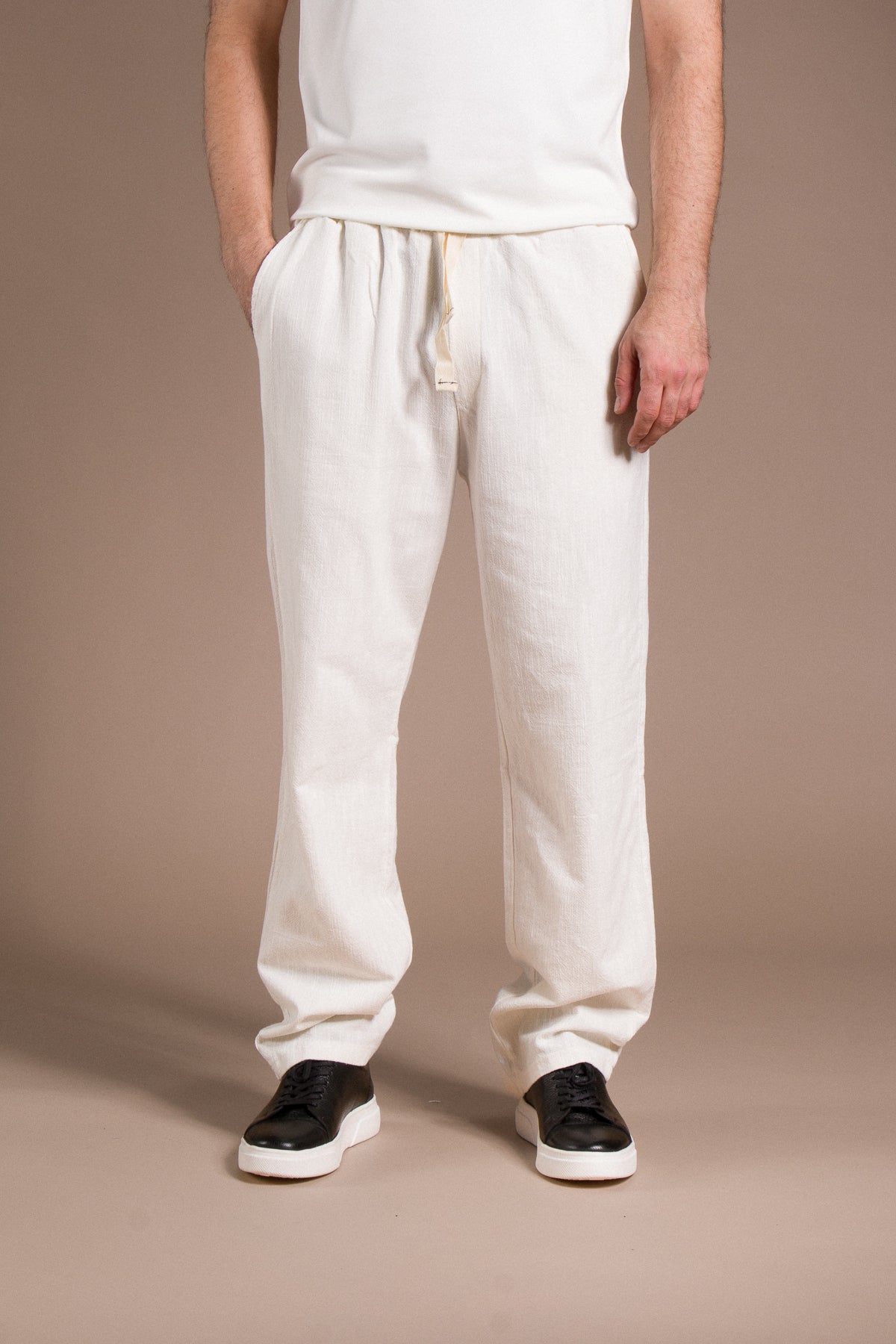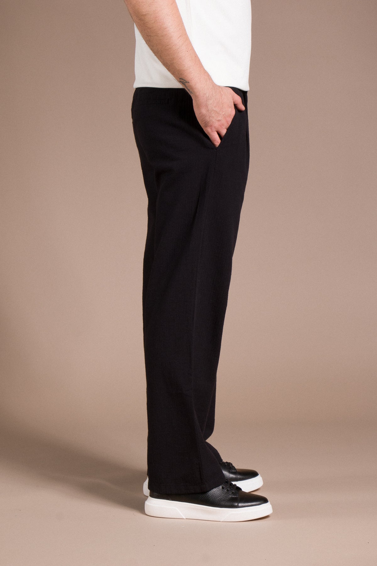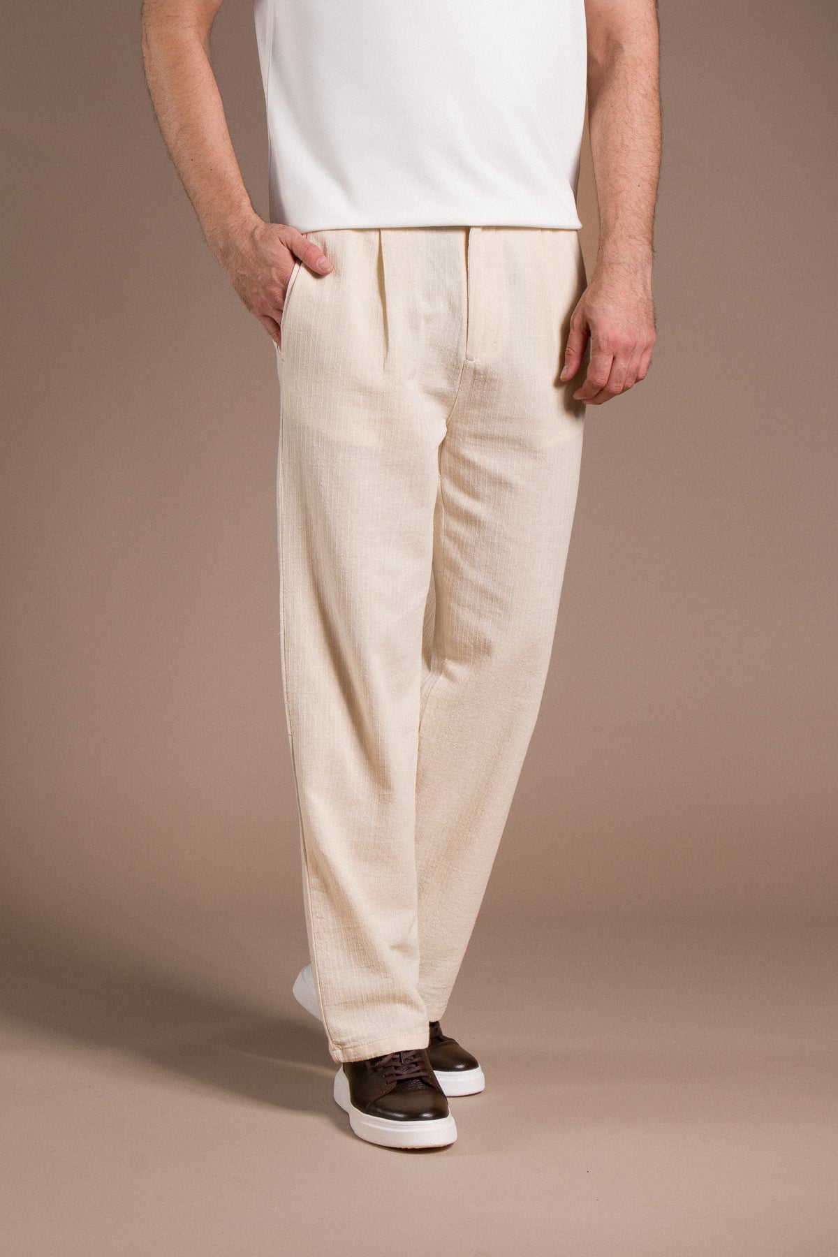 Hafif dokusu ve zamansız tarzıyla her kombine uyum sağlayan pantolonları keşfedin.